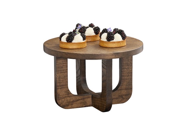 Add height and dimension with the Melrose Round Riser. This chocolate-brown oak riser with unique curved legs elevates displays naturally and elegantly - perfect for retail or buffet setups.