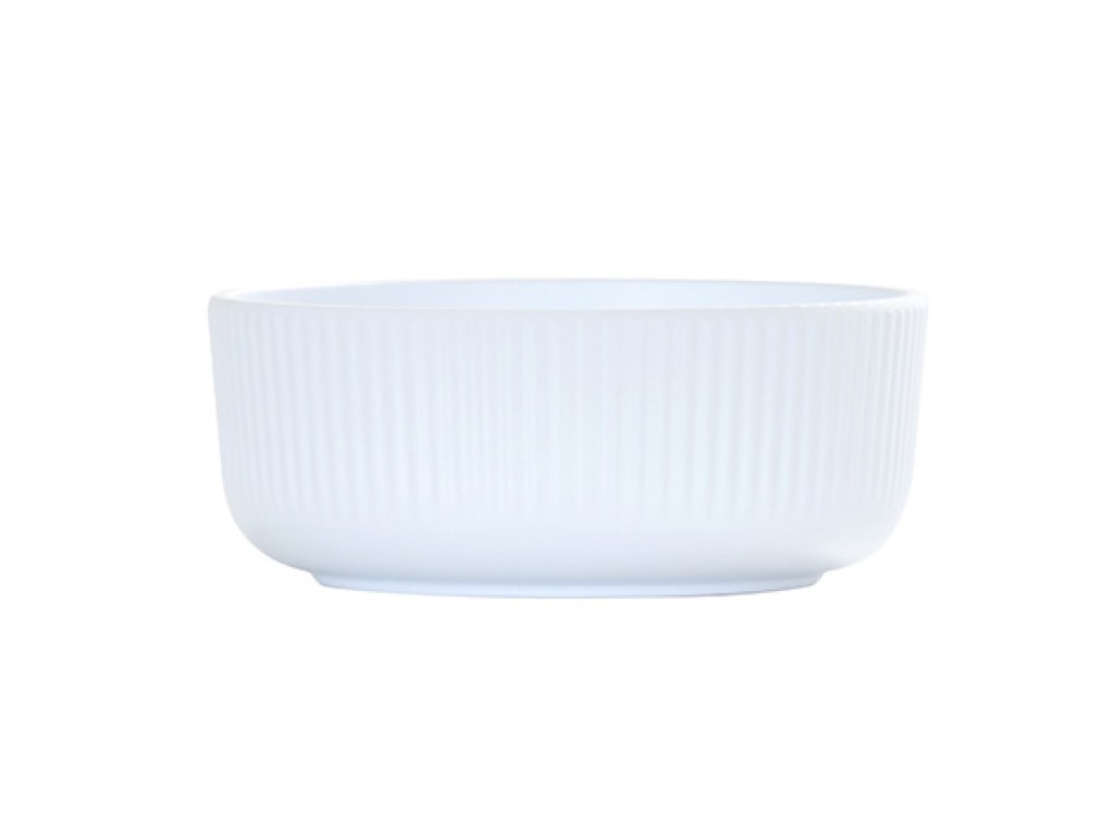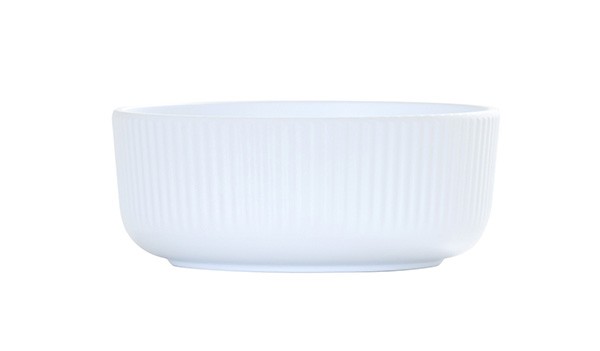 The Arista 30 oz White Bowl offers generous capacity with a premium matte finish, ribbed detailing, and curved edges - ideal for grain bowls and entrée portions.