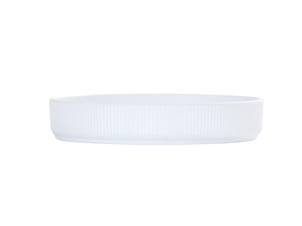 The Arista 6" White Raised Rim Plate features a sculpted raised edge, ribbed matte finish, and curved silhouette -perfect for desserts, sides, or small composed plates.