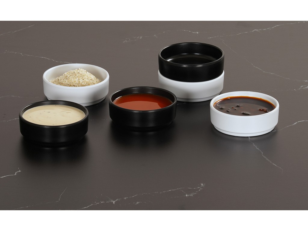 Use these simplistic and elegant melamine ramekins to display sauces and condiments. Made of premium melamine, they are stackable to increase storage capabilities when not in use and also come available in 6 different colors!