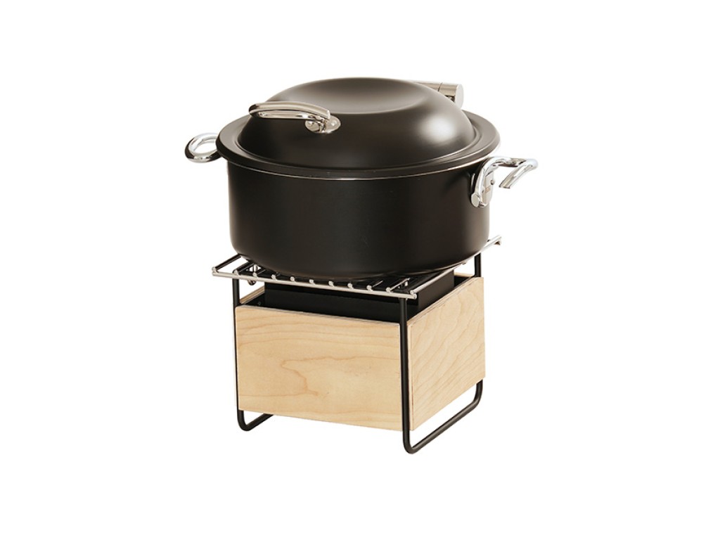 Cook, serve, and showcase your dishes with this stylish alternative to conventional chafers. The Logan Square Chafer Alternative features birch wood and black wire accents, offering a modern way to present your food while keeping it hot.