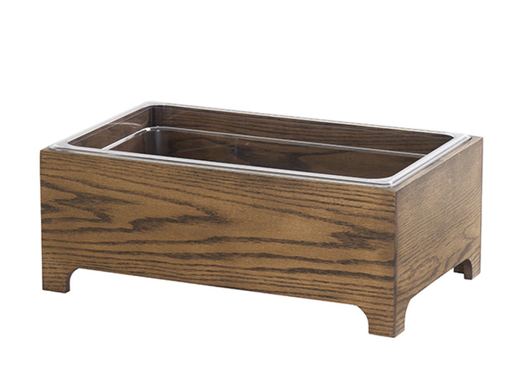 This Melrose Ice Housing keeps beverages or food chilled in style. Featuring a chocolate-brown oak design with elegant curved details underneath, it’s perfect for catering, parties, and any buffet setup.