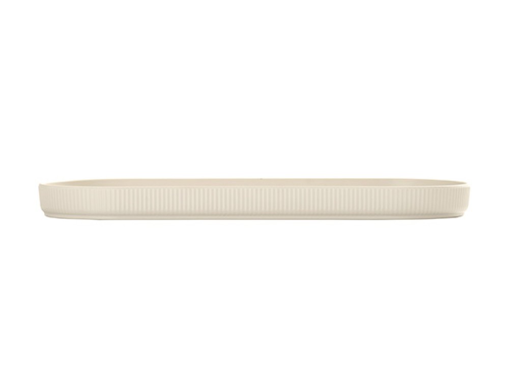 The Arista 20 x 8" Ivory Oval Platter features a sleek oval shape, ribbed matte finish, and curved edges - perfect for sharing plates, composed displays, and elevated buffet presentations.
