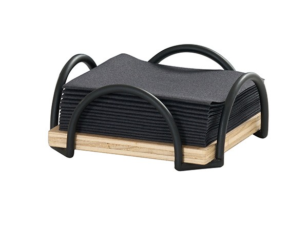 This Logan cocktail napkin holder features playful black wire loops paired with a minimal birch wood base, designed to hold any standard cocktail napkin perfectly.