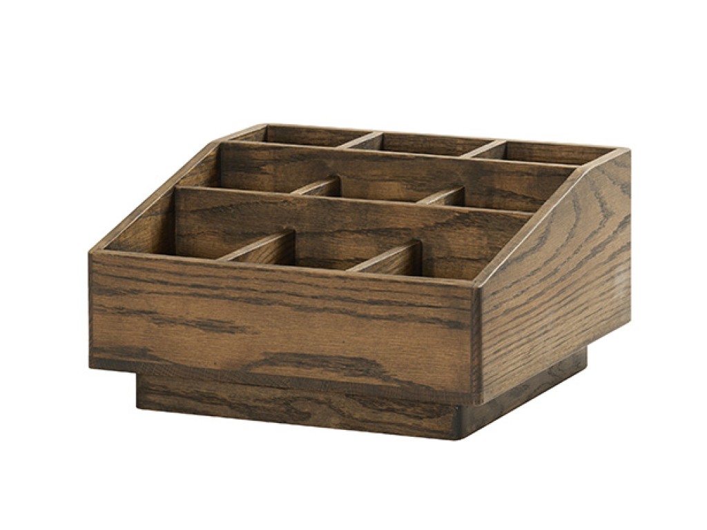 The Melrose Collection 9-Section Organizer is crafted entirely from rich chocolate oak-stained wood and features a recessed bottom design. A refined, organized solution for elevating buffet and countertop presentations.