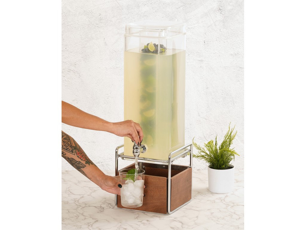 Mid-Century 3 Gallon Square Beverage Dispenser with Walnut and Chrome Base and Infusion Chamber